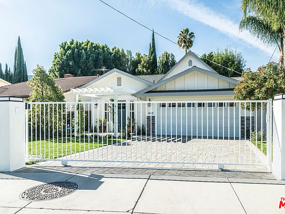Come fall in love with this incredibly charming East Coast traditional remodeled gated house. Step up into an East Hampton pergola entry porch and enter this house into a spacious foyer with taupe gray solid white oak hardwood floors that continue throughout. Ascend into the light filled old world vaulted ceiling living room and continue through the formal dining area into the heart of the house: an inviting open-plan white shaker kitchen / family room, which includes high end appliances, a built in entertainment center, a white brick gas fireplace and overlooks the garden through french doors. Full of joy master bedroom, with an ensuite bathroom, also overlooks the garden and is accessible through french doors and stairs. Large lovely backyard with BBQ area. The home also offers a dedicated in-home office and roomy attic area that can be converted into a studio/loft. Walking distance to Ventura Blvd!