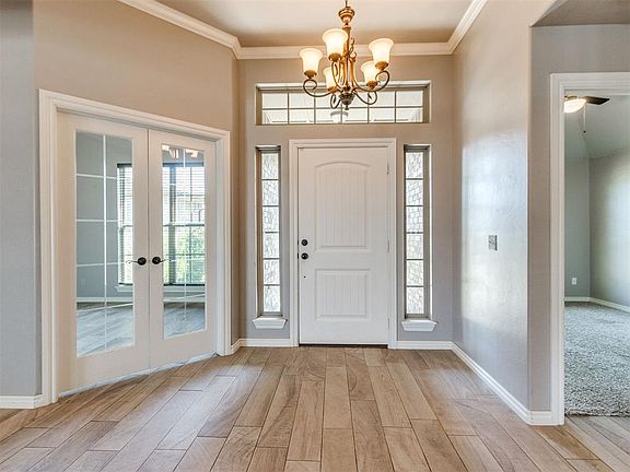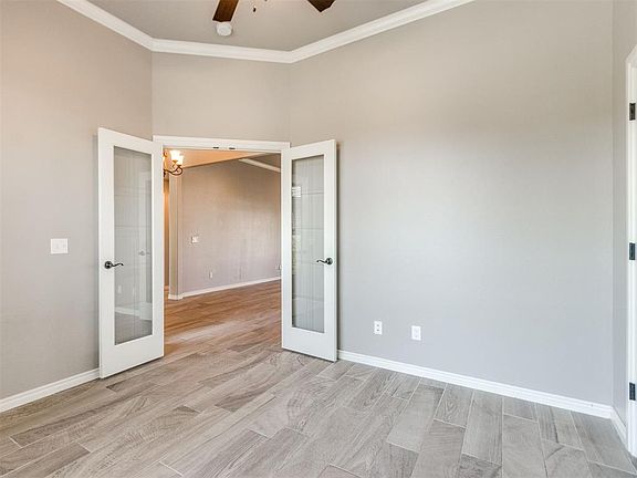 SELLER IS OFFERING TO PAY $5K of BUYER CLOSING COSTS! A beautiful home tucked away on a cul-de-sac lot that feels even larger than it is with the open area adjoining to the west. Situated on rolling hills with mature trees and landscape and a charming light post create an inviting curb appeal. This split bedroom plan offers the option of a 3 bed plus a study or a 4 bedroom home! The spacious and open living/kitchen features a stone enhanced gas fireplace and large island. French doors open to the study/4th bedroom which offers a closet. Wood look tile flooring flows throughout all the living space and there is carpet in the bedrooms. The primary bedroom features high ceilings and a luxurious full bath with a huge whirlpool tub! The back patio offers a great covered space for outdoor fun! Other features include; pantry, wood blinds throughout, front storm door, and rain gutters.