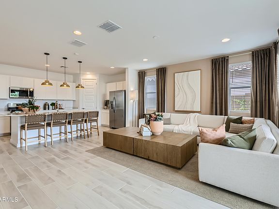 Photos are of a model home. A generous open living space serves as the heart of this single-level home, offering seamless transition between the Great Room, kitchen and dining room, while sliding glass doors lead to a covered patio for indoor-outdoor living. You will find plenty of room for your family with three secondary bedrooms and a stunning owner's suite complete with a spa-like bathroom. Complete with maple cabinets stained in shade Latte (brown), quartz countertops and 6x36 porcelain tile flooring. A copy of the public report is available on the Arizona Department of Real Estate's website.