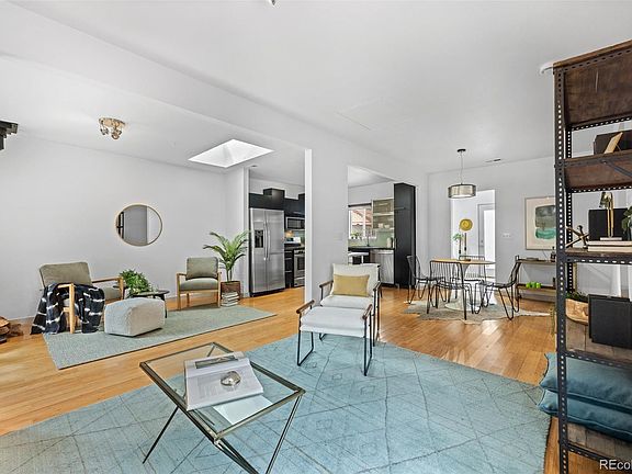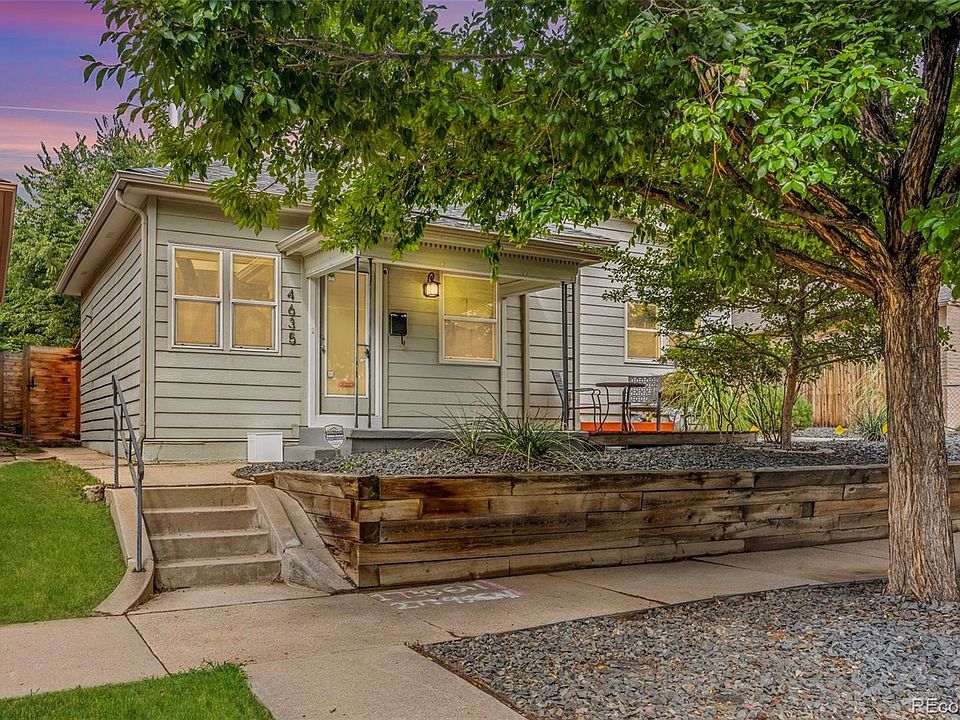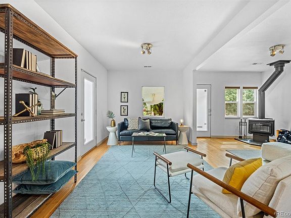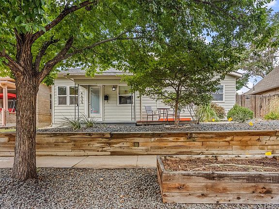 Sitting proudly above a quiet, tree lined street, this lovingly maintained Sunnyside home features an open layout, two spacious bedrooms and an oversized THREE-car garage. Light pours in through large East and West facing windows and a centrally located skylight. A well-equipped and updated kitchen offers plenty of space for entertaining. The front room boats a newer EPA rated Zero Exhaust wood burning stove to keep the entire home warm and cozy in the winters. Tucked away from the living space is a large primary suite with ample natural light, a generous closet and a full en-suite with a double vanity. The second bedroom is conveniently located near the second full bathroom, and features a wall of shelving and a sizable closet. Laundry conveniently located at the mudroom closet. There is no shortage of outdoor space to enjoy, with a welcoming covered front porch, a private, tucked-away deck to the side, and a fully fenced backyard complete with mature trees, professional landscaping and a pergola-covered fire pit or sitting area. Walk to All of Sunnyside’s best retail, restaurants, coffee shops and parks. Easy access to downtown, I-70, LoHi, Berkeley, and I-25. New 3.5 car garage for all of your parking, storage, home-gym and hobby-related needs. New main waterline in August 2023. New roof 2017. Newer furnace, refrigerator and dishwasher. This home is ready for a quick move-in!