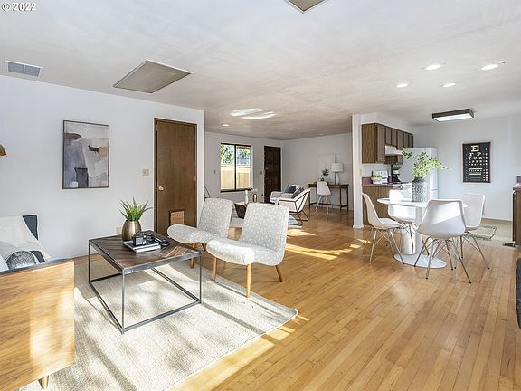 Private, SINGLE-LEVEL abode cloistered by lush landscaping yet blocks to fabulous venues, eateries, pubs & convenient markets. Inside, gather-worthy great room spaces include reclaimed maple floors (from a Hood River gymnasium) & wood-burning fireplace. Two MAIN LEVEL bedrooms include primary suite w/half bath ideal for roommate situation or aging in place. All just a few blocks to Wilshire Park & minutes to PDX airport or downtown PDX. Oversized garage w/shop space. [Home Energy Score = 4. HES Report at https://rpt.greenbuildingregistry.com/hes/OR10206526]