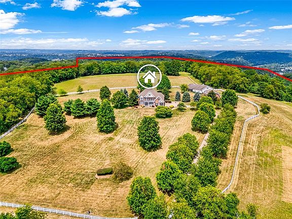 DREAM EQUESTRIAN ESTATE. This stunning property offers luxurious living on 60 acres w/ views of Chestnut Ridge & the US Steel Building, 15 miles from PGH. Enjoy a 16x32 saltwater pool. Brick home features matching 30x50 detached garage w/ 3 commercial stalls, a workbench, 150-amp electrical panel, & 1,500 sqft unfinished space above for possible apartment. Features include a 2nd-floor laundry, family room w/ wet bar & kegerator, & an office w/ a French door to the kitchen. Cherry wood cabinetry, granite countertops. The Grecian ceiling adorns dining room, & the master suite includes a tray ceiling, Jacuzzi, sitting room w/ gas fireplace, & 2 walk-in closets. Stamped concrete patio & all-brick covered sun porch. The 48x72 barn includes a heated tack room, wash stall, & 4 Paddock/Dutch door stalls.. 3 rail vinyl & electrobraid horse fencing. 300,000 cubic sq ft FREE GAS heats all buildings & house! Walk to 400 Acres of the Allegheny Land Trust and the Allegheny river.
