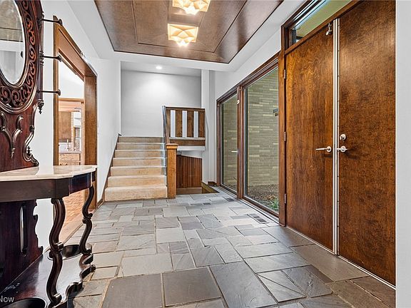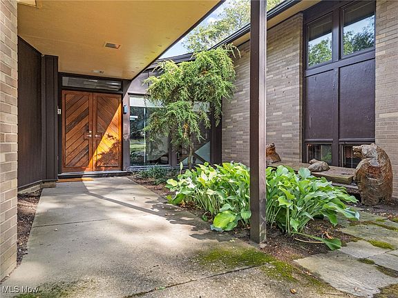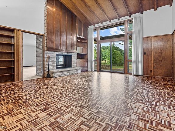 This Estate has been owned by the same family for the last 60+ years and is being sold as-is. Designed by Robert Foresythe, the acclaimed architect of the Pro Football Hall of Fame, this dramatic midcentury modern home is an architectural treasure waiting to be discovered. Step inside through custom double wood doors into the slate-tiled foyer, opening into a grand family room where soaring wood-beamed ceilings set the stage for elegance and comfort. Rich parquet flooring adds warmth, while a striking floor-to-ceiling fireplace blends copper and stone into an unforgettable focal point. Walls of windows flood the home with natural light, showcasing custom built-in bookcases and a hidden wet bar - perfect for entertaining with seamless flow to the concrete patio and wood deck overlooking a tranquil pond. The authentic 1960s commercial-grade kitchen and dinette add vintage charm, while flexible floor-to-ceiling sliding wall panels allow you to open or separate the kitchen, dining, and living areas for any occasion. A double-sided wood-burning fireplace connects the living and family rooms, creating cozy ambiance in both. Upstairs, you’ll find four bedrooms and three full bathrooms, including a spacious primary suite with its own bath. Two of the secondary bedrooms are connected by a Jack-and-Jill bathroom, providing both function and privacy. On the lower level, a versatile fifth bedroom/office, rec room, and full bath expand the home’s flexibility. A few steps down in the sub-basement, you will find what was designed as a bomb shelter during the cuban missile crisis which now would be perfect for a wine cellar or canning room. A convenient half bath on the main level completes the thoughtful layout. This home has been virtually staged. With 5 bedrooms, 5 bathrooms, and nearly an acre of park-like land with a pond view, this one-of-a-kind residence offers architectural pedigree, modern comfort, and serene natural beauty—all in a single timeless package.