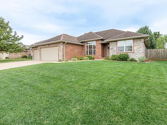 Come out and see this well-built and beautiful ranch-style home conveniently located in Meadow View Estates in Battlefield. Built in 2004 and featuring a brick and stone front, a gorgeously landscaped flat yard, and tremendous curb appeal shows the pride of ownership in this home. Great front entry with oversized formal dining, a spacious great room, and custom kitchen including newer appliances and loads of counter space. The seller is leaving the refrigerator as well. Split bedroom floorplan with a master suite that features a modified California-style bathroom including separate closets, double vanity, a jetted tub, and separate shower. Private lavatory with extra cabinetry as well. Other features include 2 large guest bedrooms and a guest bath on the west wing of the house. The backyard is immaculate with a covered patio overlooking a flat and fully privacy fenced yard. Behind the garage is an extra concrete pad and storage shed. Access to the 3 car garage from the backyard makes those weekend projects a snap! Especially with the 3rd bay of the garage having been converted to a workspace with extra power and loads of storage for tools. A Beautifully designed home in a quiet neighborhood, easy access to James River Expressway, and excellent Mcbride/Wilsons Creek, Cherokee, Kickapoo schools checks all the boxes so come take a look today!