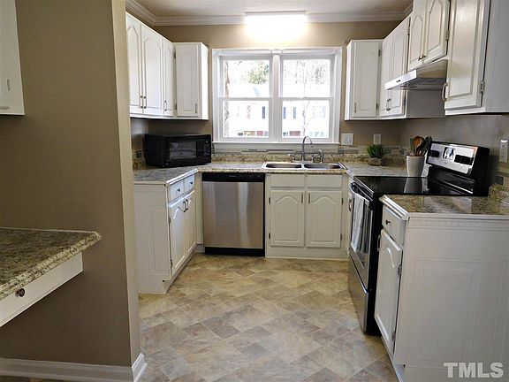 Beautifully updated ranch townhome in fantastic location - minutes from shopping and RTP! New paint and flooring! Eat in kitchen with newly refinished cabinets, new counters, sink, disposal and stainless steel appliances. Nice sized pantry and built in desk for extra workspace. Awesome living room has new luxury vinyl plank flooring, vaulted ceilings and wood burning fireplace. Side porch and back deck for you to enjoy. Home backs to the woods, very private and quiet. Shed on deck for extra storage needs.