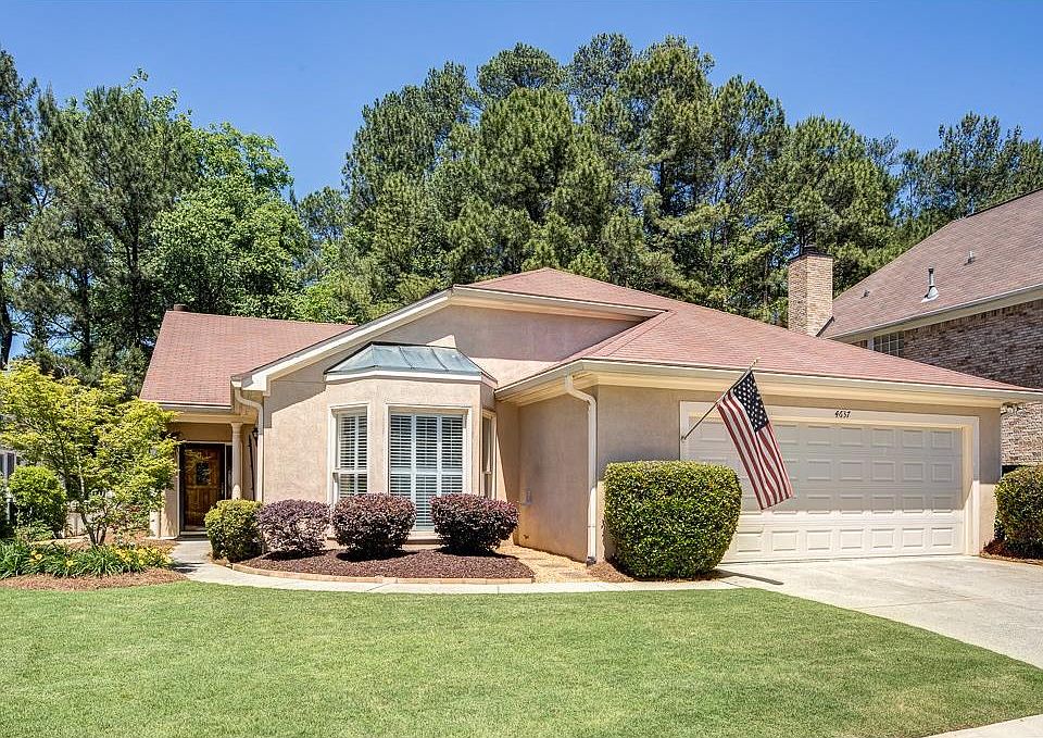 One level living on quiet street with two car garage, convenient to 285 and Dunwoody/Perimeter shopping and dining. Spacious home with large vaulted great room and formal dining room. Light-filled multipurpose room can be used as breakfast, keeping or family room. Private master suite has whirlpool tub, separate shower, two walk-in closets and double vanity. Second bedroom and bath is separated from master. 3rd bedroom with double pocket doors currently used as a den. Entrance foyer, fireplace, built-in shelving, two private patios and abundant closet space.