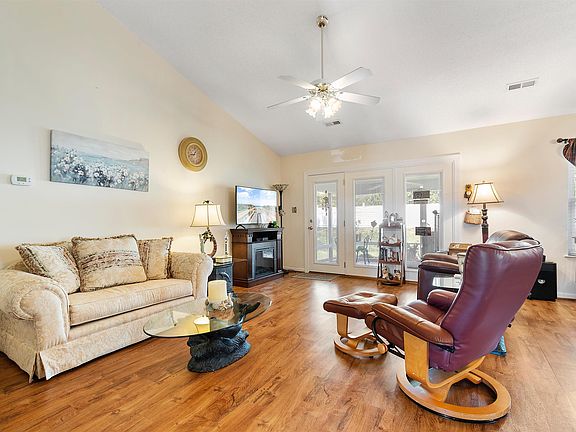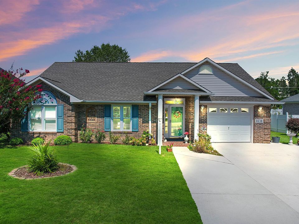Welcome home to this lovely 3 bedroom 2 bathroom home located in the Royal Estates subdivision in Little River. This beautiful all brick home features a spacious open layout with vaulted ceilings, tile and wood flooring throughout, a plethora of natural light, attached garage and large fenced in backyard! The front door opens to a quaint entry way overlooking the open concept living room and dining room. The main living area has hardwood flooring, vaulted ceilings, and is flooded with natural light from the windows and sliding glass doors which lead your eye onto the back screened patio and large fenced back yard with an outdoor shower. To the left of the dining area is the updated eat in kitchen. The kitchen boasts new stainless steel appliances, tile flooring, a large pantry, as well as access to the garage. To the right of the living area is the master bedroom which provides a walk-in closet, a en suite bathroom with soaking tub, a separate standing shower, a double vanity, a toilet and storage. Continuing straight out of the master bedroom on the right will be the laundry closet which has storage as well as a washed and dryer. Just beyond the laundry closet on the right is the guest bathroom. The guest bathroom has tile flooring, a shower / tub combo as well as a vanity with storage and a toilet. Adjacent to the guest bathroom is the guest bedroom. Both guest bedrooms provide good size closets, ample natural light as well as vaulted ceilings and ceiling fans. This home is located in a peaceful area of Little River just 8 minutes from the beach as well as local shops and eateries. Schedule a tour today and buy this home tomorrow!