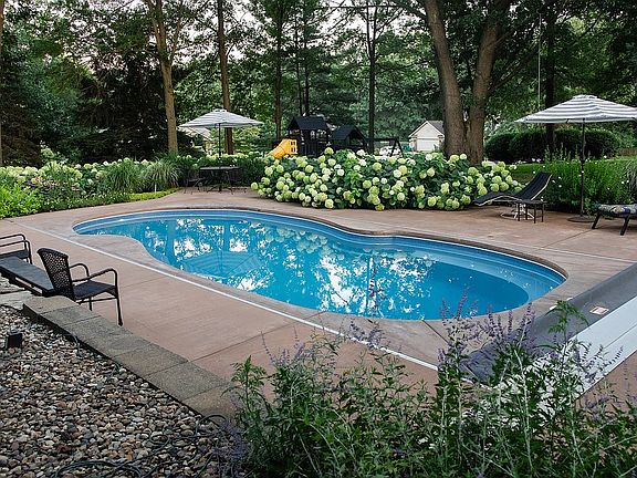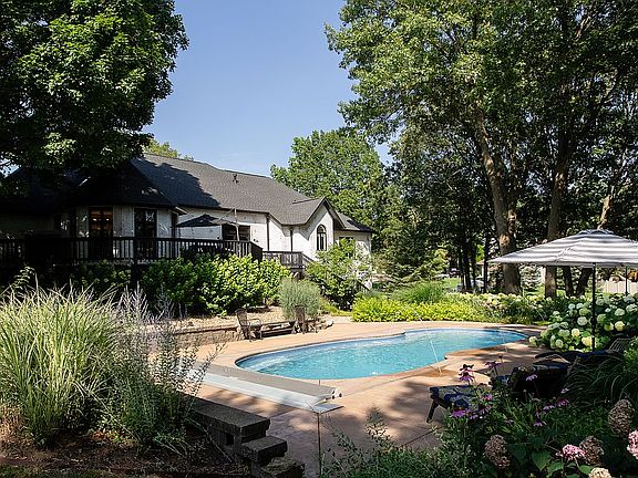 Look no further for a home that will satisfy your wish list. Sitting on a two full lots (front & back) at just over an acre is this sprawling 5000+ sq ft all brick ranch. Upon entry, the 11 foot coffered ceilings will impress. The updated kitchen features premium appliances and has an adjoining gathering room with fireplace and an atrium style eating area with abundant natural lighting and skylights. Home features 4 bedrooms including a spacious master suite with hardwood flooring throughout. Lower level is impressive with features including 900 sq ft of custom concrete flooring, wet bar with appliances, large media room, fireplace and plenty of open space for kids to play. Walk out to your private hot tub area and new fiberglass saltwater pool that is virtually maintenance free. Beautifully landscaped and fully irrigated across the property.