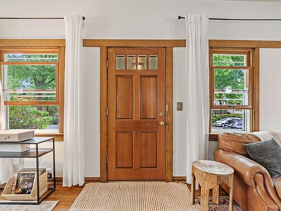 The main level includes two bedrooms, one updated full bathroom, and a kitchen showcasing custom oak dovetail cabinetry, soapstone counters, stainless steel appliances, and new range hood. Original hardwood floors and woodwork showcase the craftsmanship and character, with abundant natural light filling the spaces. Built-in storage adds convenience throughout the main floor. The upstairs offers two additional bedrooms, including the primary suite with updated walk-in full bathroom.