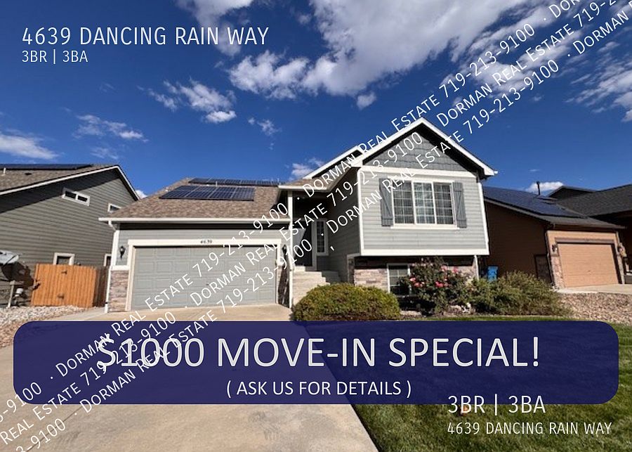 The owner of this property is offering a special incentive of $1000 off the first month of rent! Please contact us if you have questions. Welcome to this stunning 3-bedroom, 2.5-bathroom home located in the heart of Colorado Springs, CO. This tri-level property boasts a spacious layout with vaulted ceilings and LVP flooring throughout. The kitchen is a chef's dream with a convenient pantry and a breakfast bar for casual dining. The bedrooms are generously sized, with the master featuring a walk-in closet. The large unfinished basement offers endless possibilities for storage, man cave, or craft area. The home also includes a 3-car garage, with a standard 2-car and an additional tandem space. The property is equipped with solar panels, making it energy efficient. The fenced backyard is perfect for outdoor activities and comes with a storage shed and a fire pit, ideal for entertaining. Landscape maintenance is included, ensuring the exterior of the home is always looking its best. The home also features central air for those warm Colorado summers and a walk-out lower level for easy access to the outdoors. This home is a perfect blend of comfort and modern living. Please check out our application handbook by copying and pasting the link below into your web browser Please read carefully. PHOTOGRAPHY/VIDEOGRAPHY DISCLOSURE: We do not take new marketing pictures whenever a rental is turned over between tenants. Therefore, the photos we provide on our listings are meant to help potential residents see the general layout of a property they do not represent the current/actual condition. If you would like to better understand the condition of a listing, please schedule a personal viewing. COLORADO HB23-1099 DISCLOSURE: PROSPECTIVE TENANTS HAVE THE RIGHT TO PROVIDE TO DORMAN A PORTABLE TENANT SCREENING REPORT, AS DEFINED IN SECTION 38-12-902 (2.5), COLORADO REVISED STATUTES; AND IF THE PROSPECTIVE TENANT PROVIDES DORMAN WITH A PORTABLE TENANT SCREENING REPORT, DORMAN IS PROHIBITED FROM: 1) CHARGING THE PROSPECTIVE TENANT A RENTAL APPLICATION FEE OR 2) CHARGING THE PROSPECTIVE TENANT A FEE FOR THE LANDLORD TO ACCESS OR USE THE PORTABLE TENANT SCREENING REPORT. While Dorman does accept compliant portable screening reports as defined by HB23-1099, which would result in no application fee being required (or possibly an application fee refund), we do still require that all tenants complete our application (click APPLY next to any property on our list of properties below). Additionally, you will be deemed qualified (or not) based on the screening information/data provided on our independently pulled report, not based on information/data on your portable report. Please note that bona fide and compliant portable reports MUST come directly from the consumer reporting agency. 3 Car Garage (2 Car Standard And 1 Tandem) Central Air Fenced Backyard Fire Pit Kitchen Pantry Landscape Maintenance Included Large Unfinished Basement Lvp Flooring Solar Panels Spacious Bedrooms Storage Shed Tri Level Vaulted Ceiing Walk Out Lower Level