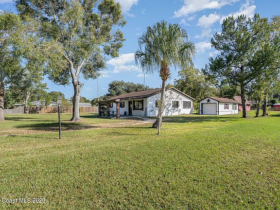 This won't last! Well maintained charming abode situated on over an acre. Live the peaceful country lifestyle & still be close to beaches, shopping, & Space Center. Step out of the house & enter a sprawling back yard. The 2 story concrete block barn w/ power & plumbing is the perfect place to get your projects completed. Work bench & tools stay. Stroll over the bridge to a quaint tool shed (also plumbed), relax by the fire pit, collect fruit from the abundance of fruit trees, go retrieve fresh eggs from the coop (chickens will stay if desired)! This is the life! A zero turn mower & push mower will be left behind to help keep the property maintained. The sprinkler system is supported by a 50 foot private well. All that is missing is y
