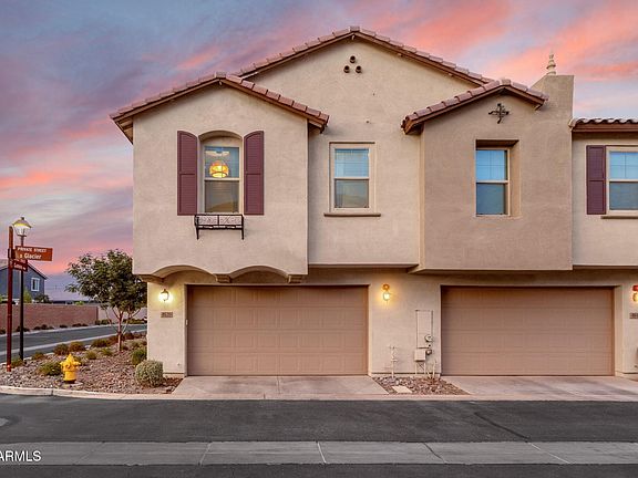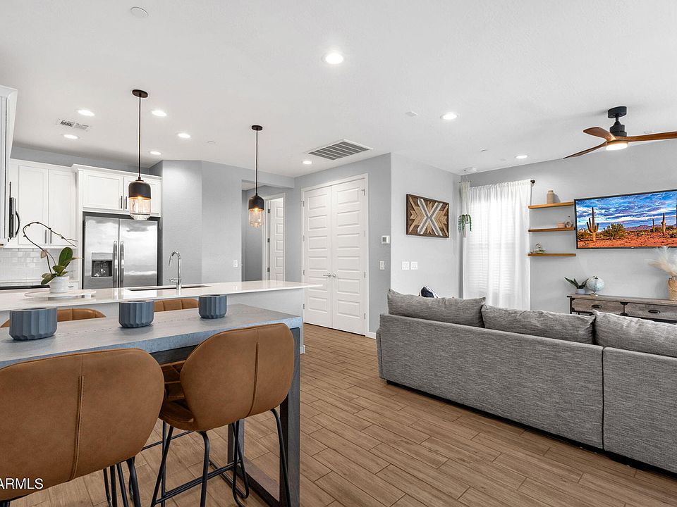 Beautifully upgraded end-unit townhome in Eastmark! This 3 bed, 2 bath home features a modern kitchen with composite sink, black hardware, pendant lighting, and custom owner's entry drop zone. Corner unit with added privacy, balcony views of the Superstitions, overhead garage storage, and 2-car garage. Eastmark provides award-winning amenities: resort pools, splash pads, parks, trails, skate park, Great Park, Steadfast Farm, and top-rated schools in a prime Mesa location.
