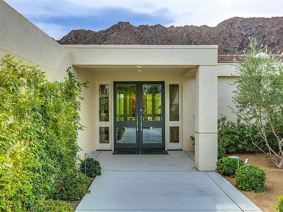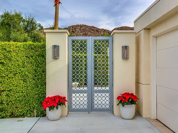 Tucked away at the end of a cul-de-sac, inside the gates of Eldorado Country Club, this exquisite home offers an abundance of privacy. The residence was extensively remodeled in 2016 and showcases a classic contemporary design throughout. Eclectic silver gates open to a walled courtyard and glass/metal entry doors. White walls, massive limestone tile flooring, and beautiful bright white custom cabinetry throughout amplify the open and light feeling of the home. Expansive sliding walls of glass in the living room and dining room open to the south-facing pool patio and magnificent views of the 13th Fairway and Cove Mountains. A wonderful den with fireplace, bar, and lovely garden views, adjoins the living room. The gourmet kitchen has a center island, high-end appliances, quartz countertops, sit-down counter, and a breakfast area with a built-in booth and custom desk. The spacious and luxurious Master Suite is exceptional! It features a fireplace, built-in TV, sitting area, and stunning mountain and fairway views. An adjoining office and connecting his/her baths and closets are a wonderful part of the design. Two elegant guest suites provide fabulous accommodations for family and friends. Additional features include a powder room, laundry room, double car garage, pool/spa, fire-pit with upholstered bench seating, and a built-in BBQ.