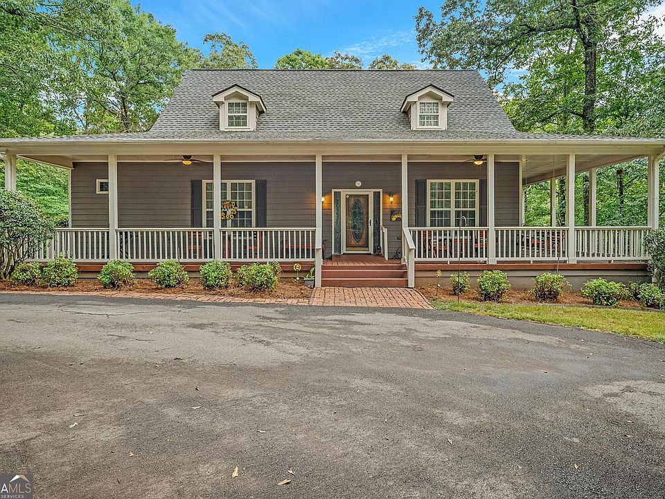 Welcome to your dream home, nestled on over 3 private acres with breathtaking views of Snapping Shoals Creek. This picturesque property boasts a detached 3-car garage and a wraparound covered front porch, perfect for enjoying the serene surroundings. As you enter, you're greeted by a formal living room and dining room, ideal for entertaining guests. The spacious kitchen features stainless steel appliances, a breakfast bar, a breakfast nook, and connects seamlessly to a living room with built-in shelving, perfect for an office space. The primary bedroom is a true retreat with an en suite bathroom that includes double vanities, a walk-in tiled shower, a whirlpool tub, and a sauna. Also on the main level, you'll find a sunroom, a half bath, and a full laundry room. The upper level offers two additional bedrooms and a full bathroom, providing ample space for family or guests. Outside, you'll love the wraparound porch, the raised deck overlooking the creek, and the detached 3-car garage with an unfinished loft space that can be customized to fit your needs. Best of all, this home comes with no HOA restrictions, giving you the freedom to truly make it your own. This home is a perfect blend of comfort, luxury, and natural beauty. Don't miss the opportunity to make it yours!