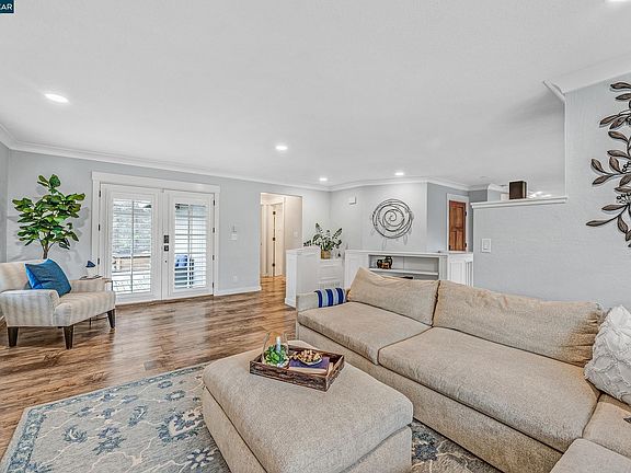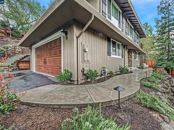 Rarely do you find a hidden gem like this home nestled in the trees, off the main road, yet so close to downtown! Fantastic floorplan with primary bedroom on the main level with 2 separate large bedrooms on the lower level. Solid custom doors throughout with recessed lighting added and beautiful vinyl plank flooring. Bathrooms updated to include new vanity, lighting and flooring. Crown molding interior upgrades along with custom wiring throughout. Professionally landscaped includes new hardscape, patio, trek deck, exterior lighting and sparking new hot tub/spa 2022. Sport court and exterior deck for BBQ and entertaining with amazing views. Marvelous views from the dining and living room and outside deck! Lusciously landscape, serene setting with outdoor spa set perfectly in the backyard. The newest addition to the exterior includes a sport court! Fully fenced. Expanded driveway for parking and turning around. Additional storage off the garage. Close to town and easy commuter access yet feels secluded and is very private. Close proximity to downtown Danville and SRVUSD award winning schools. Open Sun March 12 1:30-4 p.m.