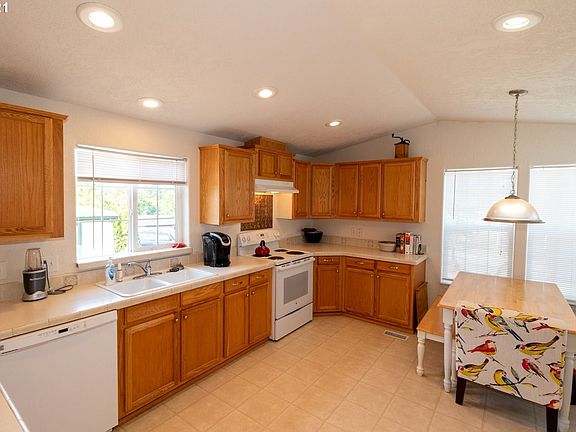 Clean & ready to go! 2 bedroom plus den, large eat-in kitchen, vaulted ceilings throughout, master with his/hers closets & large master bath. There is an oversized two car garage & protected patio, sunroom & abuts greenbelt/drainage way. Come take a look, there is a peekaboo view!