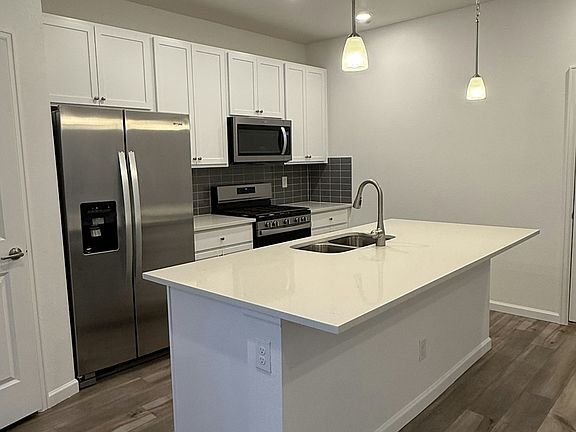 The upgraded kitchen is a chef's dream, featuring crisp white cabinets, elegant quartz countertops, a spacious breakfast island, and a cozy dining nook. The open floor plan creates a bright and inviting living space, perfect for relaxing or entertaining.