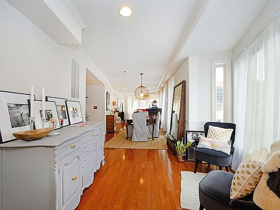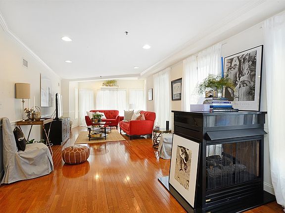 Nestled in a boutique building of only 6 residences, this unique 1,524 sqft 2 bed, 2 bath home boasts sunny exposures from every angle. Take the elevator to your very own vestibule with the ultimate privacy. Enter into a sprawling 50ft long room that has separate dining, living, and sitting areas. Enormous chef's kitchen with granite counters, SS appliances, under mount sink, under cabinet lights and large breakfast bar. Unique home details include chair & crown molding throughout as well as hardwood floors. Guest room features angled NYC views & ample closet space. Oversized guest bath highlights brand new sink, dual flush toilet, and a generous linen closet. Large master bed & ensuite master bath includes new vanity and fully jetted deep soaking tub. Other home highlights include CAC, multi-sided gas fireplace, in unit w/d, deeded covered parking and use of the gym nearby at "The OZ" building. Close to PATH, stores, restaurants and all that Hoboken has to offer.