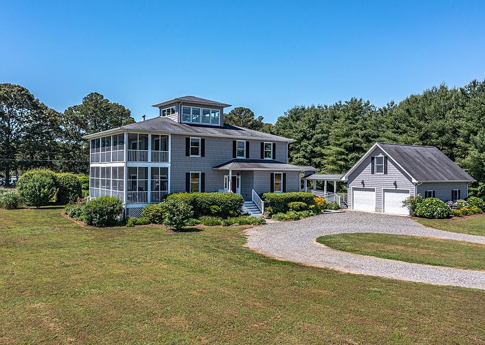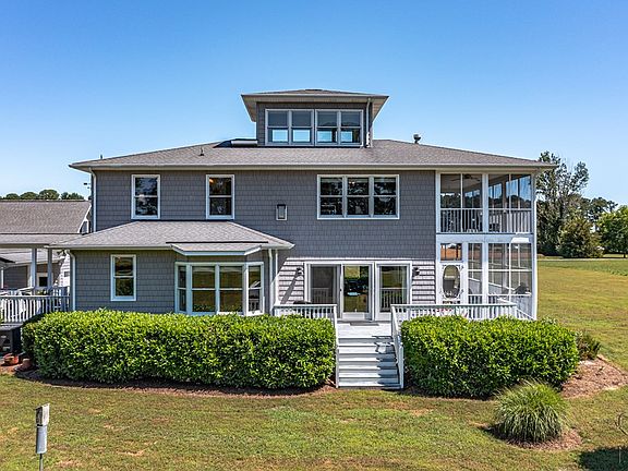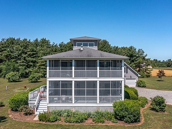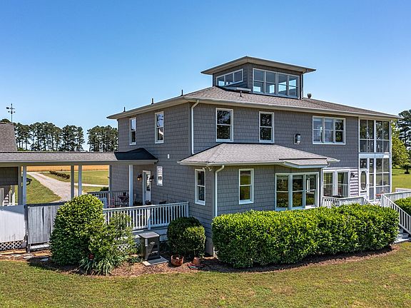 An Outer Banks inspired home with double screen porches to catch the breeze & views of the Rappahannock River and Mill Creek. Community water access to a sand beach on the Rappahannock and Boat Ramp & pier on Mill Creek are both a short walk away. And Regent Point Marina just a 3-minute drive. Water everywhere! 2.81 Acres with beautiful mature plantings, two decks and an outdoor shower. The first floor has a large great room with dining area that opens to a glorious screen porch. Two walls of windows absolutely fill the room with light. Open kitchen with granite counters, a large island and breakfast nook. This level has an ensuite bedroom for easy one-floor living or as separate guest suite. The second flood offers an additional living area with built in bookshelves, gas log fireplace and opens into the second screen porch, fondly named "the sleeping porch." The Primary ensuite bedroom is on this level with sliding glass doors onto the porch. The third bedroom and full bath are also on this level level. Just for fun and for beautiful views there is a third floor watchtower room, a perfect getaway spot for reading to catch a view of the Bridge. Wonderful home with easy water access