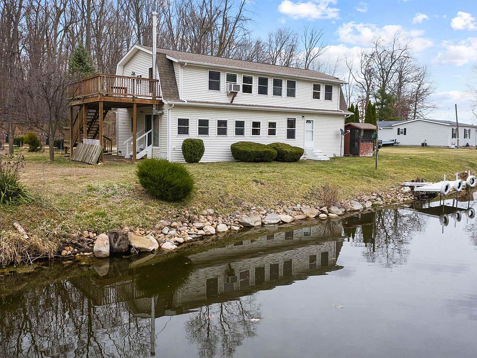 The lake is calling! Come check out this 2200 sqft, year round home with 4 bedrooms and 2 full + 2 half bathrooms on the channel of Fish Lake! Fish Lake (145 acres) connects to Royer Lake (69 acres), two great fishing lakes in Lagrange County where you can fish, paddle board, kayak and cruise around in your pontoon! 180 feet of channel frontage on two lots. This unique property has so much potential - with (2) full kitchens, (2) one car garages and (2) carports - this property is ideal for multigenerational living or just having extra space at the lake. On the main floor is an open concept kitchen and dining space with a living room with wood burning stove overlooking the channel. Also on the main floor is a full bath plus additional commode, three bedrooms with one having a large walk in closet and its own personal laundry area. The upper level features another full kitchen, dining area and open concept living room with electric fireplace. There is a large upper deck (each level has separate entrances if needed) perfect for BBQs, relaxing and enjoying the peace and quiet of the area. The half bath and upper laundry room also doubles as storage/pantry space. There is another full bath and large bedroom on this upper level with 3 closets! Additionally there is a small room with no closet that could be an office, den or small bunk bed room. The second lot does have existing utility hookups including sewer, an older well and electricity to the garage. Outside there is a small screened shed complete with a sink, the perfect fish cleaning station, you'll need it! Time to grab your fishing poles and come on! Property backs up to a state nature preserve on a dead end private lane.