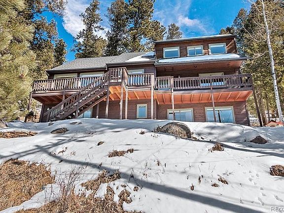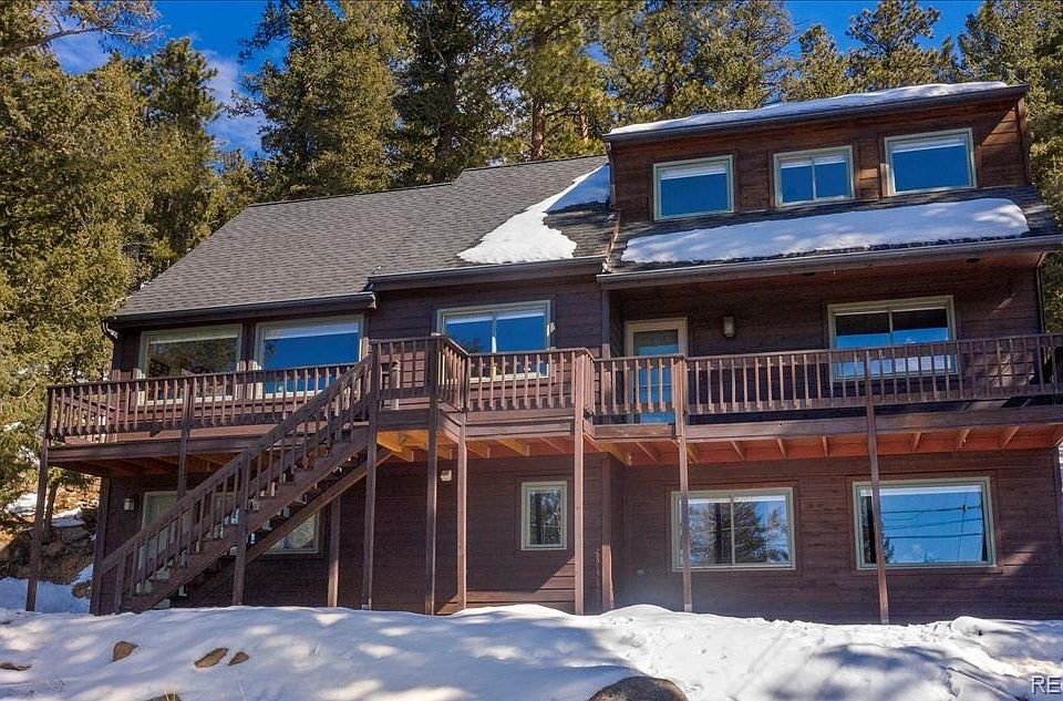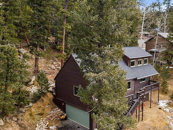 Back on the market due to Buyer financing. Seller is offering new roof prior to closing. Perfect location to walk to your favorite patio in downtown Evergreen. Walking distance to hiking. Peaceful backyard, in a park like setting with beautiful rock outcroppings. Located on a well maintained, paved road. Property is on City of Evergreen utilities. Stunning Mt. Evans views from all rooms in this recently updated home located in the hills above downtown Evergreen. Granite counter tops, custom cabinets, top of the line stainless steel appliances with a 4-burner gas range and wine cooler complete this cook's kitchen. The open floor plan on the main level includes a bedroom, updated full bath, and large living area with vaulted ceilings and gas burning fireplace. New carpet throughout, with Acacia hardwood in the dining room and kitchen. The upper level of this home is your new master retreat with vaulted ceilings, renovated bath, walk-in closet and spectacular views. The lower level bedroom, with its own renovated full bath, could also serve as a secondary living space. Rock outcroppings in the back make the rear deck and hot tub a serene getaway to unwind and enjoy the mountain setting. Brand new roof to be installed before close! Don't miss this incredible home close to all the community amenities Evergreen has to offer.