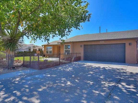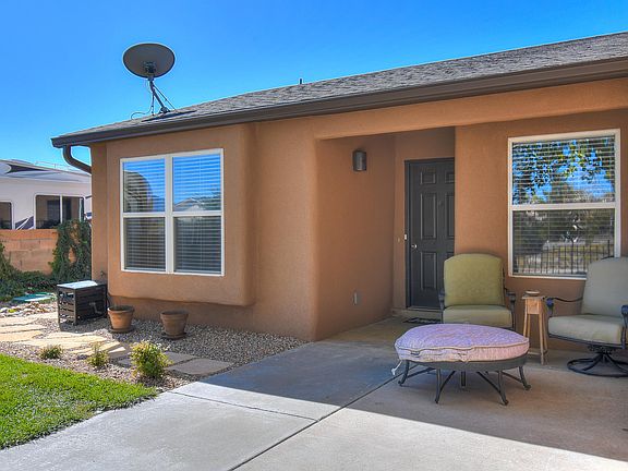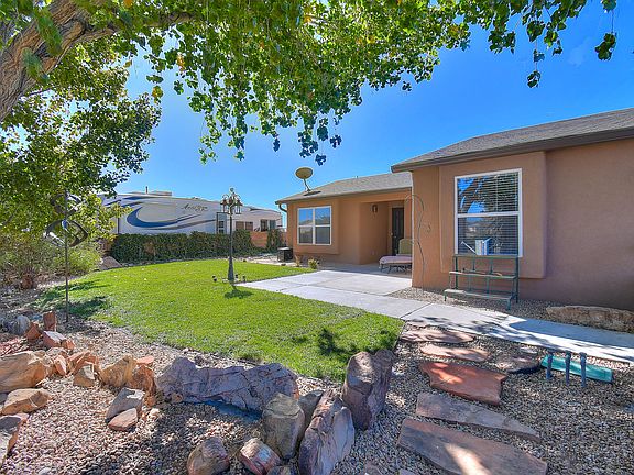 Beautifully maintained home in the heart of Rio Rancho. Turn Key and move in ready! Home features 1202 sq. ft. 3 Bedrooms, 2 Bathrooms. Three car garage with side yard access and RV parking. Great room has large windows that brings in the natural lighting. Kitchen has tile floor, granite tile countertops, stainless steel appliances, upgraded lighting, and a high top bar with seating that overlooks the Great Room. Master suite that features, a large walk-in closet, and a luxury bathroom with tub/shower and a vanity with granite top. Great backyard space fully walled and landscaped with a covered patio with a bar for entertaining and a finished storage shed/workshop. Don't miss out on this great opportunity, this home won't last long!