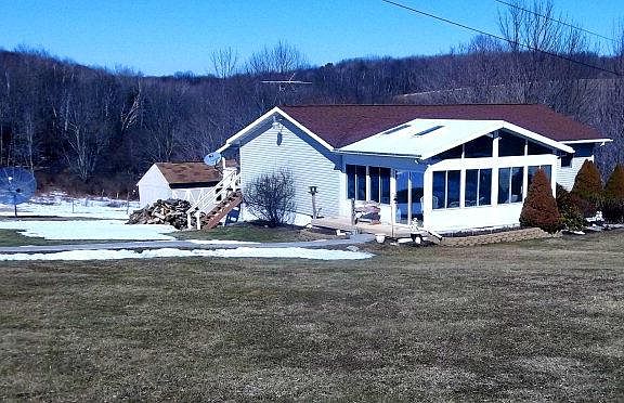 EXTRAS! Built in 1986. This home can be heated for as little as $800.00 per year !! Extra#1: Features a 4-bay garage with several heating sources * Hot water boiler*radiant floor heat**propane heat. Running water /Plumbed air pressure throughout/Paint bay/in floor frame straightener /120gal comp.Extra #2:Beautiful 16x20 Florida room with sunken hot tub/ skylights/ insulated floors! Extra#3: Cell phone 4G signal booster ! Full poured concrete basement with several rooms 80% finished for additional living. Close to State Hunting Land.....Must see!! FULL BASEMENT....MUCH MORE