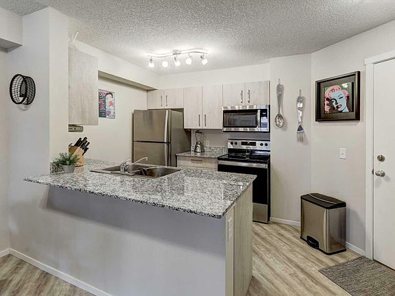 Here is a next to new, one bed/one bath home w/TITLED UNDERGROUND PARKING (stall #669) in the vibrant community of SKYVIEW RANCH. As you enter this building note the super easy to use visitor parking app located inside the lobby of the building - just scan & enter your license plate number. Once inside note the well equipped gym area for resident use - so handy & cost effective - save on having a membership anywhere else! If you are tired from your workout take the elevator back up to your home on the second floor. Entering this condo apartment you will immediately notice all of the upgrades - GRANITE COUNTERS, SS APPLIANCES, KNOCKDOWN CEILINGS, vinyl plank flooring (laid on the diagonal) & the list goes on. This home not only has a good sized bedroom but it also has a perfect WORK FROM HOME office/den space which includes a large storage hutch. Other great features include - IN SUITE LAUNDRY w/washer & dryer included, a beautiful bathroom w/all modern finishings & over the toilet storage. No space has been wasted in this home which is just shy of 600 sq ft. The beautiful NW facing balcony is quite private & is immaculately clean - as is this whole home. Lots of love & attention has been put into every detail here - this home is perfect for a single, couple or perhaps as an investment property.