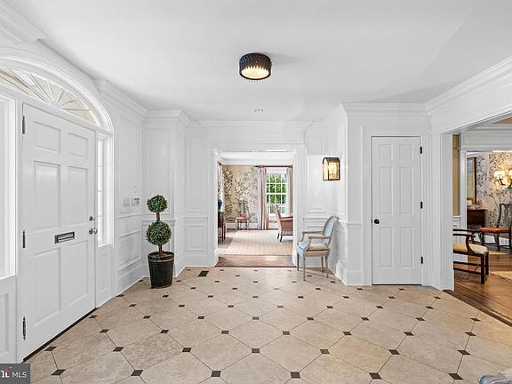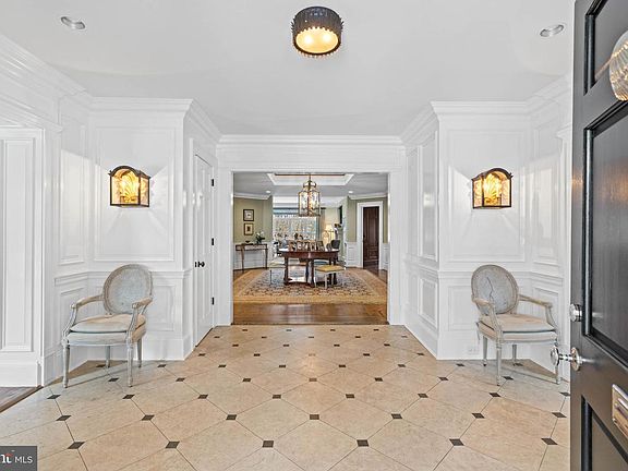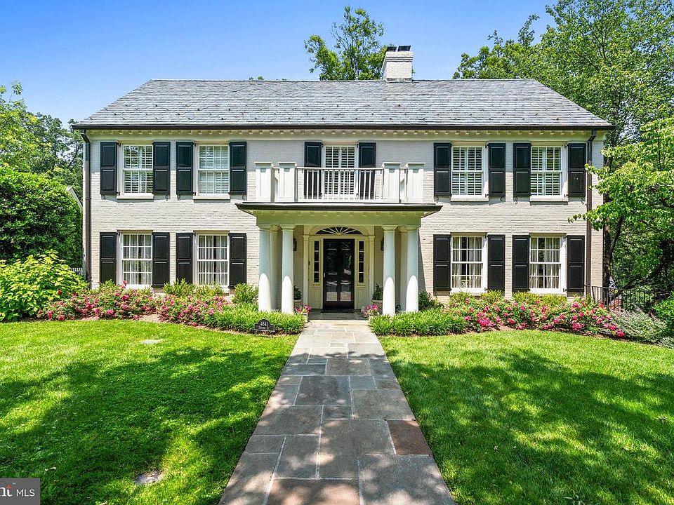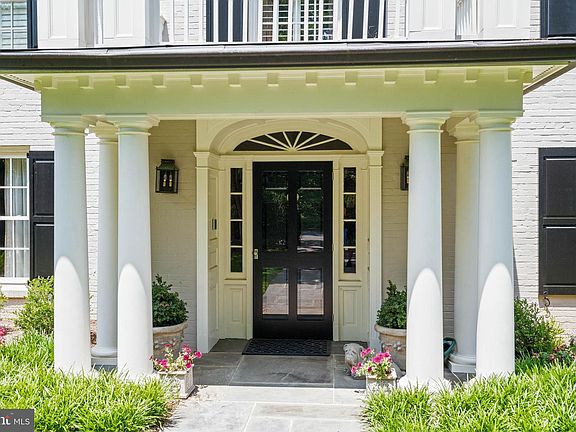 Ideally located in the highly desirable Wesley Heights neighborhood, this impressive residence is a notable example of Colonial Revival architecture. Set on a sprawling, nearly half-acre lot, it features a classic brick facade and an inviting front portico. Originally constructed in 1951, the home has been meticulously expanded and renovated by David Decker. The design and furnishings are by Andrew Law. The house offers a seamless blend of expansive entertaining spaces and cozy family living areas across nearly 10,000 square feet of interior space, making it ideal for both grand events and everyday comfort. The elegance of the main level is introduced through a gracious entry foyer that features polished marble floors, ornate crown molding, and exquisite wall paneling, leading to a breathtaking two-story central reception area with a gas fireplace. The adjoining formal living room is bathed in soft natural light from south and east-facing windows, enhanced by lovely moldings and another inviting gas fireplace. A sophisticated dining room, large enough to accommodate lavish gatherings, seamlessly connects to a well-appointed butler’s pantry. The chef’s kitchen is a masterpiece of design, boasting a central island with a breakfast bar, custom cabinetry, and high-end appliances from Wolf and Subzero. The kitchen opens onto a charming breakfast room and a family room centered around a magnificent limestone mantel fireplace. The main floor also features a richly appointed library with wood-paneled walls, a fireplace and built-in bookshelves, a serene screened porch with park views, and a discreetly located powder room. Ascending the stately staircase to the second level, one is greeted by a dramatic oversized window on the landing, offering picturesque views. The generously-scaled primary suite is a sanctuary of luxury, with a soaring ceiling, an arched window overlooking the verdant rear grounds, and dual walk-in closets. The en-suite bathroom is a spa-like retreat, complete with dual vanities, a glass-encased steam shower, a jacuzzi soaking tub, and a separate water closet. Four additional bedrooms each offer sunny, generously proportioned interiors and ample closet space, alongside a convenient laundry room. The lower level is a haven for relaxation and entertainment, featuring an impressive recreation room with a stone fireplace and built-in media center, a convenient wet bar, and direct access to the rear terrace. This floor also includes an office adorned with extensive built-ins, a gym/game room, a media room equipped with a projector, a sixth bedroom with its own cozy fireplace and en-suite bathroom, and additional storage spaces. Additionally, there is a detached two-car garage. The outdoor area is a private retreat, surrounded by mature trees and meticulously landscaped grounds, with a large, flat backyard that adjoins Glover-Archbold Park, a 183-acre stream-valley park in Northwest Washington, DC on the western edge of Georgetown. This home not only captures the essence of luxury and elegance, but also offers a warm and inviting atmosphere, making it a truly exquisite estate in the heart of Wesley Heights.