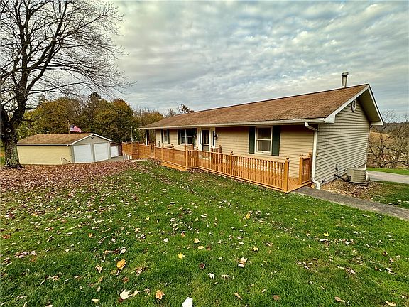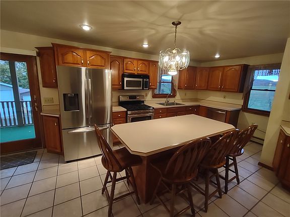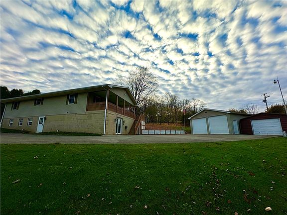 Beautifully maintained home with a gorgeous view of the fields and pasture ready for immediate occupancy! Spacious fully equipped kitchen with stainless steel appliances, oak cabinets and trim! Great kitchen Island with stools and desk area by hallway! Large dining area with sliding glass doors to deck! Open floor plan into living room! Nice stained glass entry door and sidelights! Master bedroom with half bath! Fully finished basement with 2nd kitchen, laundry and full bath! Walk out sliding glass doors in basement onto large paved driveway/parking area! Fabulous heated oversized 2 car garage with 10' doors, automatic door openers and oil furnace! Additional metal carport garage and wooden shed! Well manicured lawn and landscaping! Nicely paved driveway!
