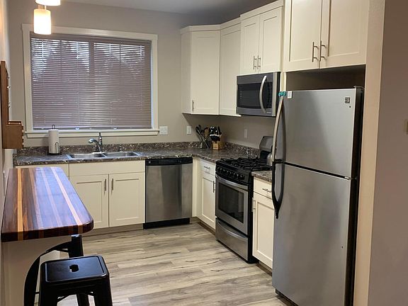 Alder Flat is a comfortable, modern and stylishly designed 2 bedroom 1 bathroom apartment unit. It is located in the Mad River Suites sub development off of Valley East in Arcata. The suite is shared with an office in an adjoining hallway each with separate private entrances. While located in a small mixed use business park, the accommodation is very private and quiet and serene! Alder Flat is conveniently located just off the 101 less than 10 minutes drive downtown Arcata and 25 minutes to Eureka. The Valley West shopping center is just a few minutes walk with Jitter Bean Coffee, Kebab Cafe, Rays Market and more. Each bedroom has a queen bed, night stands and large closets with a dresser. The bathroom is well lit and has a large mirror and shower/tub combo. The living area is open and spacious furnished with two couches, a flat screen tv, cozy electric fireplace and dining area for 4. In the kitchen there is a gas cook top and oven, full fridge, dishwasher, plenty of counter space and storage stocked with dishes and cookware, as well a breakfast bar counter. There is a locked and gated private paved yard with outdoor seating and greenery. There is dedicated private parking. Sorry, no pets. This is a month to month furnished rental, tenant pays PGE, the other utilities (water, garbage and wifi) are included in rent. $1900/month, $2850 security deposit. Inquire to fill out free application and discuss move in terms. Contact by call or email for questions and to apply. Casago Redwood Coast CA DRE #02124156 This is a month to month furnished rental, tenant pays PGE, the other utilities (water, garbage and wifi) are included in rent. $1900/month, $2850 security deposit. Inquire to fill out free application and discuss move in terms.