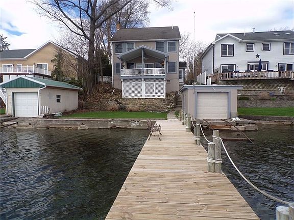 Amazing opportunity on this Pristine "Seneca Lake" Front home with 50' of lake frontage. This home was transformed into an open floor plan with gleaming hardwoods, Anderson window, stone fireplace, AC, updated baths, kitchen & more in 2001. Upon entrance you will be awed by the cathedral ceilings with open staircase to second level. Well cared for with endless views of Seneca Lake from every window. 1st floor bedroom & bath for guest convenience, 2nd floor offers large full bath, master bedroom, guest bedroom & huge walk-in closet. Beach front is private & well manicured with boathouse, 72' dock with hoist & seating! Huge Bonus$$$ is the "Air B&B" unit addition on rear of 2-car garage. This studio is so appealing to all who visit making it a very lucrative opportunity (permitted use w/sep. septic & utilities). Plenty of storage under garage, spacious yard for plantings, garden or just lounging. You will enjoy all the Lake has to offer! Preapproved buyers only with 24 hour notice.