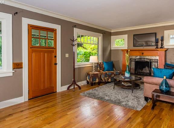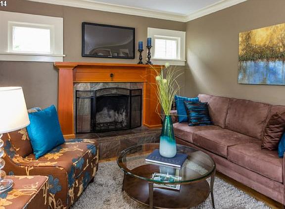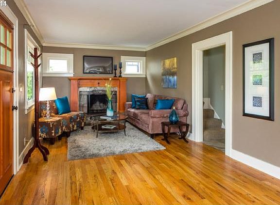 PDX-Perfect 1911 Bungalow in vibrant Alberta Arts.Restored using high-end ss appliances, tiles, cabinetry w/period knobs & SchHouse fixtures.Oak hrdwds on main;living rm is framed by wood-burning fireplace & mantle made w/reclaimed wood.A bdrm & bthrm are also on main.Kitchen features farm sink & ample storage.Upstairs has oversized master bdrm,2nd bdrm & bthrm featuring carrera marble & heated floors.Private bkyrd w/singing birds! AC!