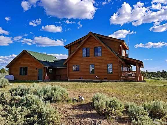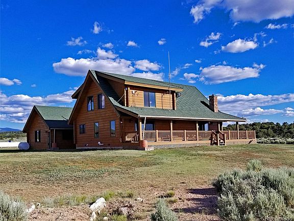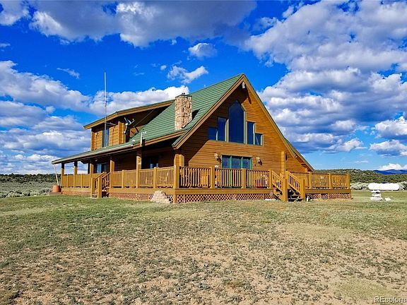Nestled among towering pinyon pine trees, the beautiful log home sits as a picturesque retreat on top of the Wild Horse Mesa. Standing strong, this true wood Colorado home is a unique and beautiful representation of the state's natural environment and lifestyle. As one steps onto the spacious deck, they are greeted with sweeping views of the San Luis Valley below, where the sun sets in a symphony of vibrant colors every evening. The beauty of the sunrise over the Sangre de Cristo mountain range will invite you to rise early. The interior of the home is just as stunning, with vaulted ceilings, a cozy stone fireplace, and large windows that frame the breathtaking scenery outside. Beautiful woodwork, UV-filtering Anderson windows, open concept floor plan, large closets, laundry, mud room, loft and an incredible 17 x 16 main level primary with en suite. This idyllic setting offers a perfect escape from the hustle and bustle of city life, inviting residents and guests to relax and immerse themselves in the beauty of nature.