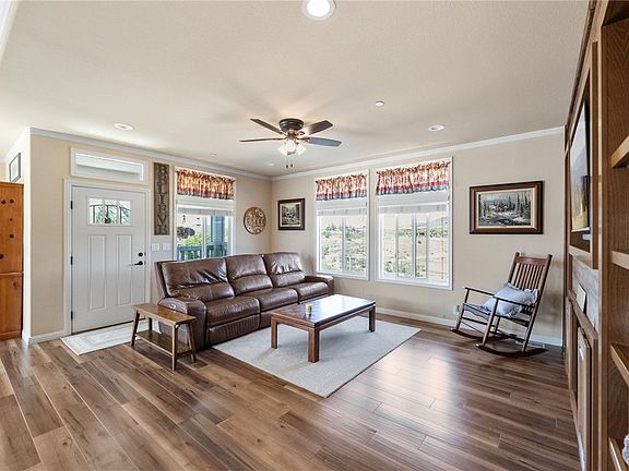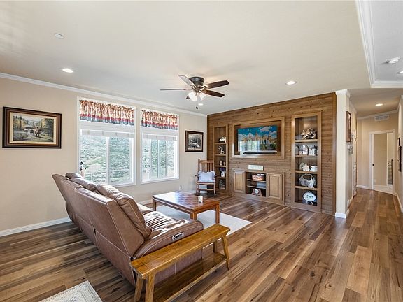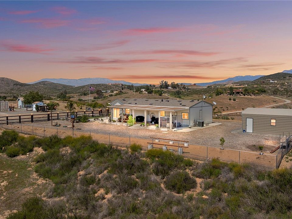 LOOKING FOR A PRISTINE HOME, LAND & STORAGE OPTIONS? This Oakridge Ranches home is beautifully upgraded and delivers the serenity of rural living without sacrificing modern comforts. Whether you're dreaming of a horse property, a hobby farm, or just some wide-open space to breathe, this Oakridge Ranches retreat has the freedom you’ve been craving. Behind the gated entry, a charming front porch invites you to slow down and savor your morning coffee in the quiet stillness of nature. Inside, the open-concept layout makes the most of the view, with high-end laminate flooring, crown molding, and a spacious great room that spills effortlessly into the gourmet kitchen. Here, you'll find granite countertops, upgraded cabinetry, a coffered ceiling, stainless steel appliances, built-in trash storage, and plenty of cupboard space. The primary suite is privately tucked at the back of the home and feels like a true escape with its large soaking tub, walk-in shower, dual vanities, coffered ceiling, and walk-in closet. Two additional bedrooms and a full guest bath (with an unused shower!) provide comfortable accommodations for guests and family. Outside is where this property really shines. A massive 47' x 15' aluminum patio cover with recessed lighting and outlets covers a 60' x 15' concrete patio—ideal for outdoor living. You’ll also find a 20' x 24' metal garage/workshop, a 9' x 15' storage shed on a concrete RV pad (with dump station), sidewalks that wrap the entire home, two cargo containers (40' and 20'), and three 10-foot access gates enclosing the fully fenced quarter-acre yard. The property also boasts a permanent foundation (concrete slab with 40” crawl space and drainage), an upgraded 200-amp electrical panel, and an emergency backup generator system that powers everything but the A/C and well. A 3-stage water filtration system with 20” x 4” filters is located under the home, with a 2-inch water line running from the well to the rear yard. The water system is robust, with a 150-gallon-per-minute well, a 5,000-gallon water tank, and an additional 1,500-gallon poly tank for backup. A 1,200-gallon concrete septic tank also serves the home. And, if you're looking to expand, there is a separate 120’ x 70’ graded pad is ready for horses, animals, or your next big idea. This home is a lifestyle...one with sunsets, starry skies, and space to grow.