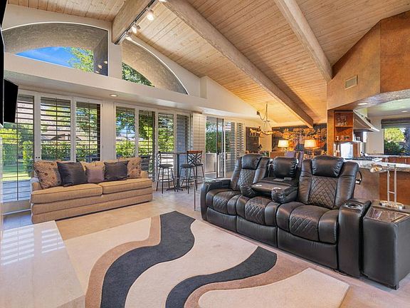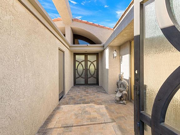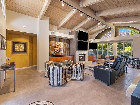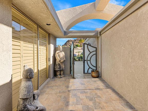 This beautiful Southwest facing home overlooks a panoramic mountain view with the pool and spa in walking distance in the foreground. Notable differences in this home compared to any others include: Additional golf cart garage, storage room, direct access from garage to home interior, and a built in BBQ Island. This corner lot home has 3 bedrooms and 3 full baths. One guest bedroom has a fully private access and can be used as a private casita. Equipped with custom built wrought iron and glass entry doors, and solar tubes, this furnished home boasts natural light throughout. The custom kitchen with upgraded stainless steel appliances has been opened to the great room with 15 foot ceilings and a wet bar. The master suite contains 2 walk in closets and access to the back patio with views of the mountains. The HOA includes landscape, paint, stucco, roof, pool/spa, and manned gates. As a bonus you are in the coveted IID electric district. There is also a gate with direct access to Indian Wells Country Club via golf cart if you are a member. Enjoy the discounted golf and deals at local hotels/spas, restaurants, shops and tennis. This great home is ready for its new owner.
