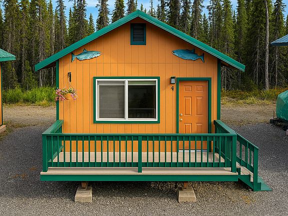 Welcome to the Lake Trout Cabin at Lower Kenai Lodge, a private retreat with a full bathroom and kitchen, just a short drive to the Kenai River. This compact but comfortable cabin serves as the perfect basecamp for your Kenai adventures, offering a studio layout with a fully equipped kitchen and sleeping area featuring two Twin over Full bunk beds. The Lake Trout Cabin is thoughtfully designed to provide a cozy and functional space for relaxation after a day of exploration. The studio layout includes a fully equipped kitchen and a sleeping area with two Twin over Full bunk beds, ensuring a comfortable stay. For pet-friendly properties, pets are welcome at a cost of $10 per pet per day. Service Animals are permitted at all properties at no extra cost. Guests are required to pick up after their pets, with a charge of $10 per exterior location if not cleaned. Unauthorized pets incur a $250 fee. Lower Kenai Lodge is nestled in a secluded area, just minutes from the world-famous Kenai River. Enjoy shared outdoor amenities such as fire pits, BBQ grills, and a covered pavilion. Centrally located between Kenai and Soldotna, the cabin offers easy access to sightseeing, fishing, and the serene beauty of the Kenai Peninsula. The water at the property is not potable, so guests should pick up drinking water on their way to the cabin. Smoking or vaping is prohibited on the premises, with a $200 per day fee for violations. Quiet hours are from 10:00 PM until sunrise. Early check-in and late check-out requests are subject to availability and may incur additional fees. Outdoor security cameras may be in use, and no cameras are located in or pointing to indoor spaces.