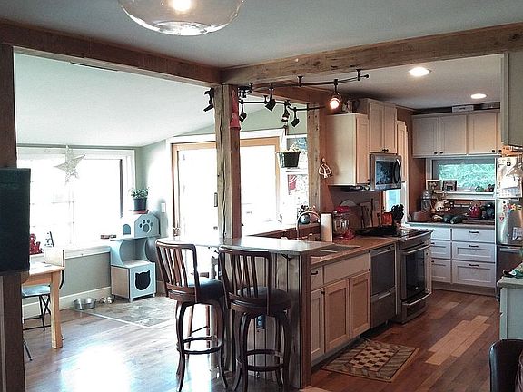 2 story home completely updated. 3 bedrooms, 2 full baths, open floor plan with living room, dining room and kitchen with wrap around bar. Wrap around deck, with additional entry porch. Detached 2 car garage with 2 over head doors, electricity, and extra room upstairs.
