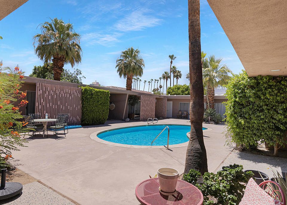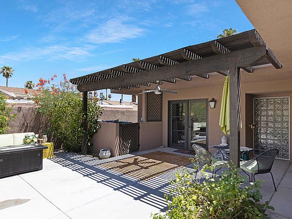 This unique Mid-Century condo in a small complex of 4 units with a shared pool in the center of the complex with low HOA fees. It is located on Ryway, a small cul-de-sac off of Grapevine. This home is very open and inviting. The kitchen appliances are stainless steel and the master bath has a large sunken shower. The guest bath has been completely remodeled. Of the 4 units in the complex, this is the only unit with its own washer & dryer inside the unit. Your client will love the views from the front patio. The property has a newer roof, flooring, dishwasher, plantation shutters, Anderson windows and sliding doors and hot water heater. The plantation shutters that are found throughout help cool the home to a comfortable level. It is also in walking distance to El Paseo for great shopping and dining. Don't miss this great opportunity to own in South Palm Desert close to the breathtaking mountains. Join Shadow Mountain Social Membership for $100.00 a month and meet the neighbors, be included in all of the social events and play one round of golf a month for free. You won't be sorry.