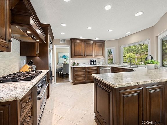 Seller will entertain offers between $1,599,000 to $1,625,000 ... Situated on an intimate cul-de-sac street in one of Yorba Linda’s most sought-after communities, the San Antonio Park neighborhood, this home perfectly blends serenity and nature with pristine updates throughout. Set back amongst mature landscaping creating a nature preserve setting on a single loaded street, this home offers an extended driveway and large grassy front lawn. Neutral wall tones, voluminous ceilings, and wood look flooring welcome you into the living space flanked with a spacious formal living room and dining room that boast beautiful views and natural light. The chef’s delight kitchen showcases a picturesque garden window, custom built-in hutch, richly stained cabinetry topped by matte leather-granite counters, and is finished with high-end stainless-steel appliances including Viking, Thermador and Bosch. Adjacent dining area and family room anchored by the cozy brick fireplace create a great room concept and an ease of indoor/outdoor living with French doors that open to the rear grounds and covered Alumawood patio. Main level offers a downstairs bedroom, full bath with walk in shower, and convenient laundry. Ascend the staircase that leads to the private owner's suite with vaulted ceiling, updated stone-infused bath featuring dual vanities topped with leathered granite, sumptuous soaking tub, walk-in shower and customized walk-in closet. Double doors off the primary suite open to reveal a generous retreat with an additional walk-in closet perfect for a nursery, gym or office (or could be 5th bedroom). Upstairs also offers two additional secondary bedrooms. One has a walk-in closet and direct access to the finely appointed hall bath, while the other, oversized in nature, provides a perfect suite or bonus room. Over half acre lot offers expansive grassy lawn space, planter areas for fruits and vegetables, multiple patio areas, large side yards and a stairway that leads to an additional flattened area perfect for exploring, sport court or gardening. The pristine three-car garage with epoxy floor, pull down storage and cabinets along with the potential for RV access complete this picturesque property. Perfectly positioned with just a short stroll to the popular San Antonio Park, local shopping, hiking trails and attends highly acclaimed Travis Ranch and Yorba Linda High!