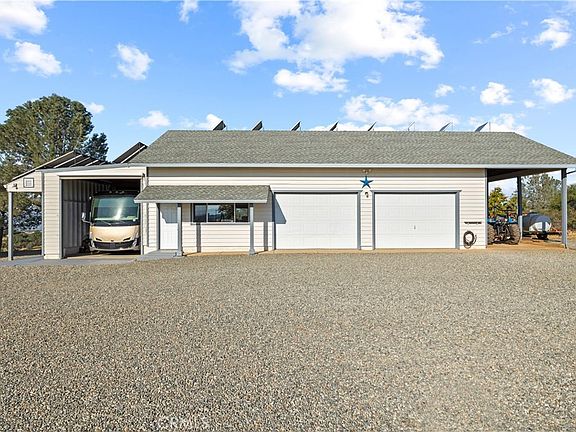 a Hide-A-Hose central vacuum, a whole house fan, Casablanca ceiling fans, 3 hot water systems, and Fiber Optic technology & an Antenna. The property includes: 16x40 RV GARAGE with 12x12 garage door and full hook-ups - Water, Sewer, & 30 Amp Electricity. Attached to the RV Garage is the SHOP with 1/2 bath & A SECOND GARAGE. OWNED SOLAR. PG&E 400 Amp Undergrouind Service. OWNED 325 GALLON PROPANE TANK. 17 kW BRIGGS GENERATOR. WELL & WATER PRESSURE SYSTEM. Aquasana Water Filtration System. 10 hose bibs around the exterior of the house. FENCED ORCHARD with fruit & nut trees, irrigated with hard-pipe sprinklers. Irrigated FENCED GARDEN AREA. To make this property easy to care for, rocks have been removed so the acreage can be mowed with your tractor mower.