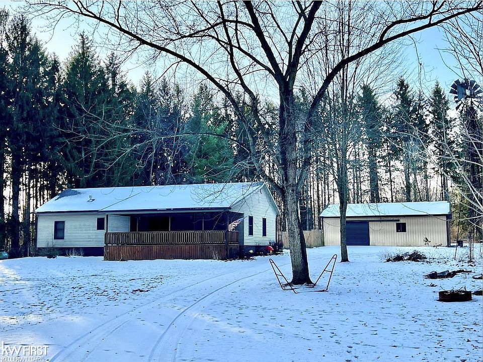 Columbiaville ~ Lapeer Schools Spacious 1900 SF, 3/4 Bedrooms, 2 Full Bath Ranch home situated on just under 5 wooded acres. Walking into this great home you will appreciate the large media room with oak built in cabinets and benches. The living room has a vaulted ceiling and is open to the kitchen/dining area with a door-wall leading to the huge covered front porch. The kitchen includes newer appliances and a island with a built in wine rack. The master bedroom offers two large closets with automatic lighting, full bathroom with a linen closet, and is on one end of the home. The 2nd and 3rd bedrooms are on the opposite side of the home and share a full bath. Main floor laundry with newer washer and dryer is right off the back door. The basement has 9' ceilings and is partially finished with a room with daylight window that could be used as 4th bedroom or office. There is a bar partially finished with all the materials to complete and room for a pool table. This home is heated with a LP forced air HVAC system with wood burning system connected to heat the home as well. Finished and heated pole barn has two large doors and is perfect for boat and toy storage. Don't miss out on the opportunity to call this private home within short distance to Holloway your new home!