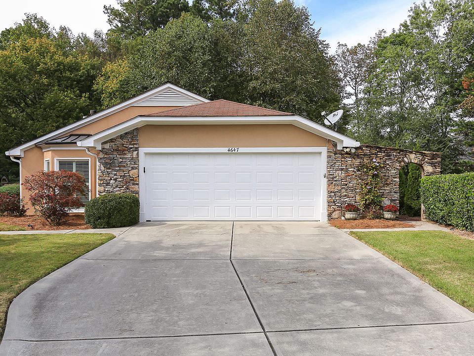 Bright step-less ranch home located in Lakeview Oaks. This quiet Dunwoody neighborhood contains both detached homes and attached cluster homes. This detached home with a private cul-de-sac location has two patios and a private peaceful wooded back yard. Sprawling floor plan with soaring vaulted ceilings. Open kitchen with solid surface counters. Hardwood floors throughout living spaces. Private master suite with double walk in closets. Large 3rd bedroom with double pocket doors can be used as an office or den/office.