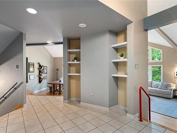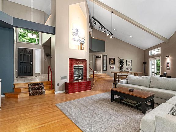 - Description: expansive living room/dining room combo, sunken room (stairs leading down), hardwood floors, fireplace, built-in shelves, vaulted ceilings, large picture windows, wet bar, doors leading to deck