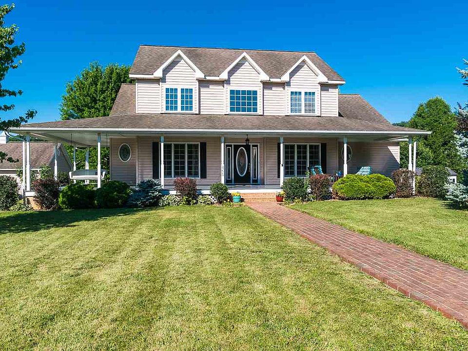 Welcoming and warm this lovely Farmhouse style home provides entertaining ease both inside and out. Wide wrap around porch with sweeping mountain views, large front yard, large two car detached garage with attic storage. Fenced, private back yard, deck with retractable awning for your outdoor enjoyment. Open floor plan with hardwood floors throughout, large rooms, high ceilings, gourmet kitchen with granite counters, stainless appliances, center island with gas cook-top opens to great room with gas fireplace & access to back deck. Large first floor master suite with cathedral ceiling & jetted tub Second floor has a lovely landing with seating, three large bedrooms & two bathrooms. Radiant heat and New main HVAC in 2017 with propane back-up.