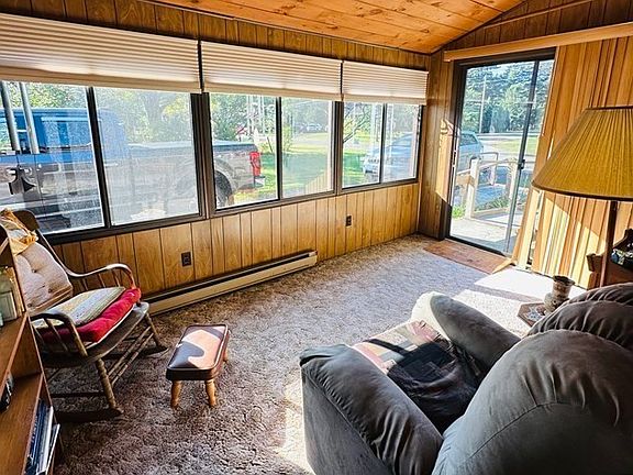 This home has been meticulously cared for and maintained over many years. Sit back with a glass of wine & enjoy the sunlit enclosed porch with its vaulted wood paneled ceiling. The spacious open concept dining/living area boasts a beautiful hand built stone fireplace allowing use as a secondary heat source when needed. A recently remodeled bath and a kitchen with attached mudroom, much needed in the Northeast, complete the first floor. Upstairs you will find two bedrooms with wall to wall carpeting each with their own closets. Includes a one car garage with workshop, separate shed and a very spacious fenced in yard.