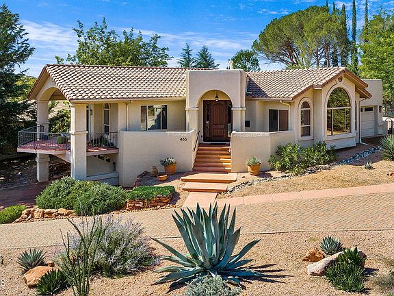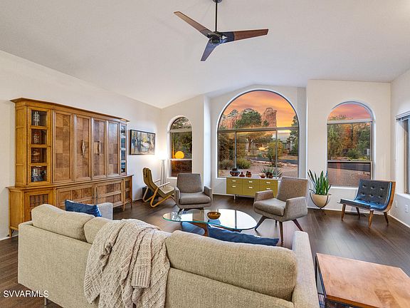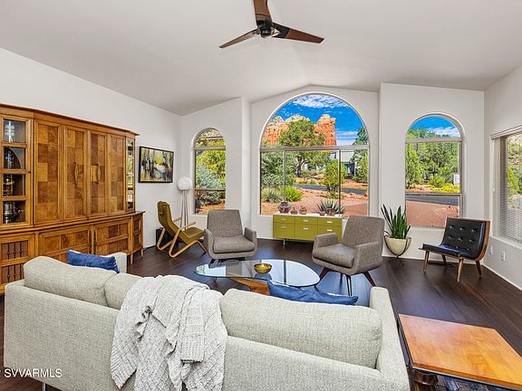 Wonderful front and side facing views are yours from this 4 bedroom jewel in the heart of West Sedona. Dripping with classy highlights and clean architectural features this gem is finished with deep rich stranded bamboo wood floors flowing through the main rooms and boasts George Nelson Bubble Saucer Pendant Lights. Kitchen has been modernized with gourmet appliances, granite countertops, custom cabinetry. Both Kitchen and Dining Area spill out onto an elevated open air deck boasting a retractable awning which leads down to the walled back and side yards complimented with raised flower beds, a bubbling water feature, and a flagstone patio which could be the perfect place for a hot tub. Main floor living boasts a gorgeous living room with a glass tiled gas fireplace and tremendous views right out your front windows oright out your front windows of Sedona's Famed Red Rocks. Wake up in the morning looking at that same view from your primary bedroom Ensuite, or enjoy your morning coffee from the primary bedroom's covered patio enjoying those views! Primary bedroom has its own door leading to the laundry room! How convenient! Primary Bath is complimented with a separate tub/shower, a walk in closet and dual sinks. Main living is completed with a second bedroom, full bath, laundry room and a 1 car garage with interior water. Need extra space? Use your imagination and turn the garage into your art studio, a study, another bedroom, or use it as a dog washing station after hiking! Or keep it as a garage and live completely on the main floor without every having to use steps or stairs! Home boasts sharp design features including arched windows, high ceilings, opened crossed beams and a center placed circular stairwell which leads to the lower level. How elegant and classy. Lower level offers 2 bedrooms, one being used currently as an office with a built in desk and cabinets, an additional 3/4 bath, a large family/media room, and a 2 car garage with wall to wall built in cabinets. Additional features include an outdoor storage shed and a beautiful circular paved driveway. Close to famed hiking trails, no active HOA, and on city sewer, natural gas and AZ water. . All furniture is available under a separate bill of sale making this move in ready. This is a shining jewel, perfect as your treasure!