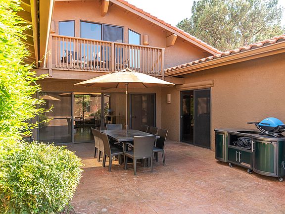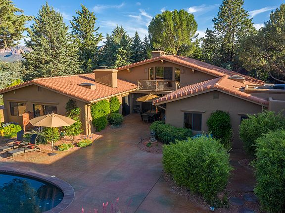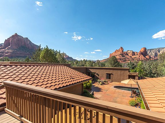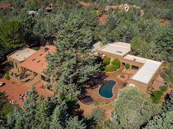 Ready to get away from it all? This private, luxurious Villa located in pristine and beautiful Sedona borders U.S Forest Service and offers red rock views all around. Enjoy the ease of one-floor living with three in-suite bedrooms in the main home each with its own fireplace. A two bedroom/2 bath guest quarters and a separate meditation/yoga room with bath also grace the property . Completely private 1.32 acres with lush outdoor living areas ripe for entertaining friends and family that including a waterfall and reflecting pond, fire pit, pool, hot tub, decks, patios and gardens. Parking for your RV and cars. No HOA. Short Term Rental OK.. Estimated rental income available. Furnishings avaiable under separate bill of sale. Rental Projection