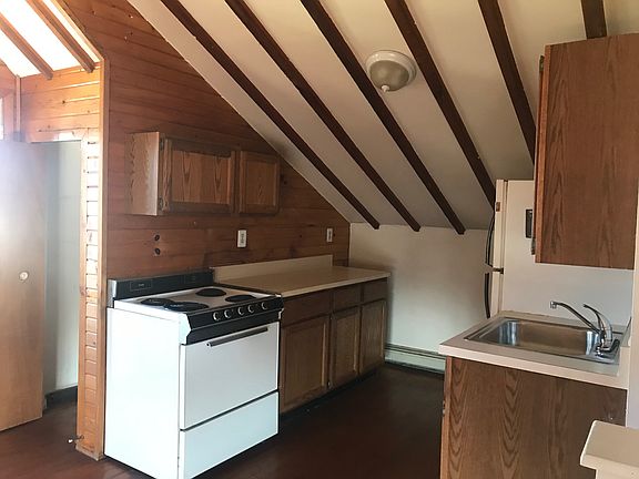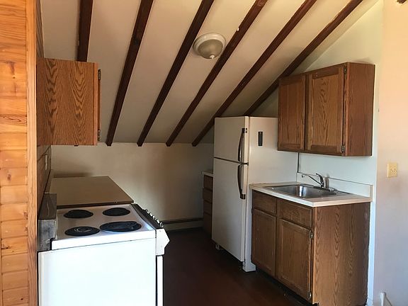 Discover this unique and expansive third-floor apartment, full of natural light and charm. Featuring an open-concept layout, the space boasts soaring vaulted ceilings with exposed beams, gleaming hardwood floors, and a bright, airy atmosphere throughout. The full kitchen opens to a private deck perfect for enjoying morning coffee or hosting a sunset BBQ with tranquil treetop views. A cozy bedroom alcove offers privacy without compromising the open feel, and generous closet space ensures plenty of storage. Located in a quiet, well-maintained building with only three units, this apartment offers peace and privacy. Additional amenities include private off-street parking and on-site washer and dryer access. Available August 1st. This spacious sanctuary won't last long schedule a viewing today! Renter is responsible for water/sewage fee, electric, oil heat. No smoking, no pets. One year lease.