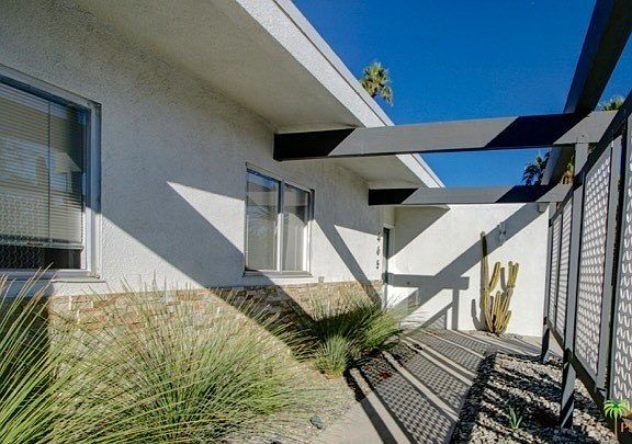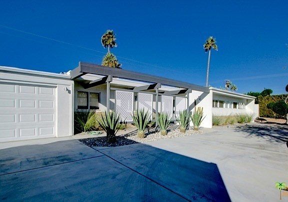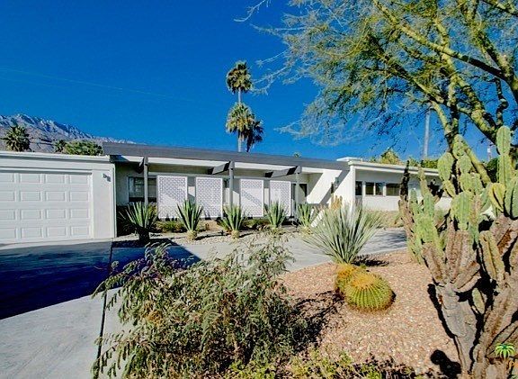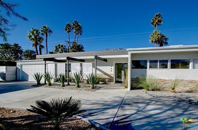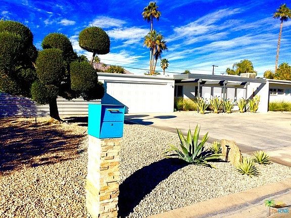 Enjoy the desert lifestyle in this impressively reimagined 1950's Mid-Century Atomic Ranch in Central Palm Springs with 3 BR, 2.5 BA and 2-car garage on land you own. Home enjoys a private yard with amazing west facing mountain views, salt water pool with mosaic tile surround, water feature and state-of-the-art programmable pool light to help you set the evening mood. Post and beam front exterior with ledge stone blends effortlessly with the double glass door entry and an interior consisting of terrazzo tile flooring, a kitchen with bar counter that opens to the dining room and offering custom cabinetry, quartz counters with striking glass bar backsplash, stainless appliances and a Bertazzoni professional series gas range. Bathrooms are enhanced in the same eye-catching style. There is a walk-in closet in the master suite and a beautiful fireplace in living room. Home uses a wise mix of fruit trees, xeriscape landscaping and artificial turf.
